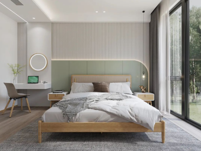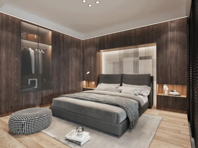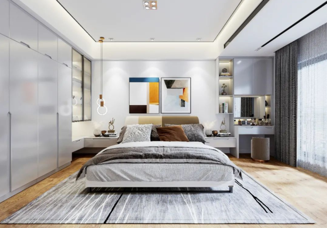 在預(yù)算充足的條件下,還可以選擇直接在床頭背景墻定制收納柜,內(nèi)嵌置物格或者定制壁龕,放置常用的物品或者裝飾品,它比床頭柜的儲(chǔ)物能力強(qiáng)很多,但反而不會(huì)占據(jù)太多空間。