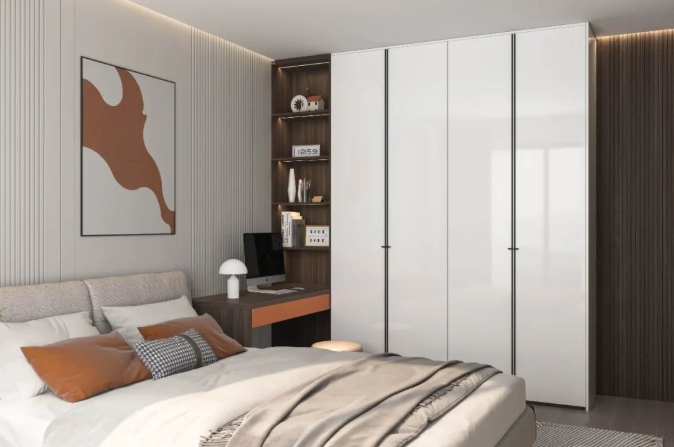 1.衣柜+工作臺(tái)將衣柜最內(nèi)側(cè)設(shè)置為開放格,從開放格延展出一個(gè)臺(tái)面作為工作臺(tái),既可以用來辦公,也可以代替床頭柜的功能,巧妙利用了轉(zhuǎn)角空間,讓臥室更顯干凈整潔。