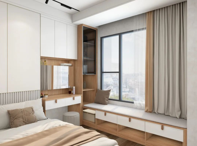2.飄窗柜+梳妝臺(tái)床頭定制梳妝臺(tái),也能起到代替床頭柜的作用。越靠近窗戶,化妝時(shí)就能擁有更優(yōu)越、更自然的采光,而且還可以與儲(chǔ)物柜、飄窗柜相結(jié)合,既節(jié)約了空間,又增加了功能性,是非常適合小戶型臥室的設(shè)計(jì)。