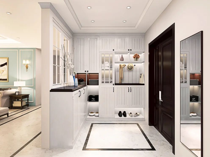 玄關(guān)作為進(jìn)門的第一區(qū)域,是從室外到室內(nèi)的一個(gè)過渡空間,其設(shè)計(jì)直接體現(xiàn)了整體空間的檔次和美觀性,能影響很多人對這個(gè)家的第一印象,除此之外,玄關(guān)還具有儲(chǔ)物收納、空間隔斷等功能。