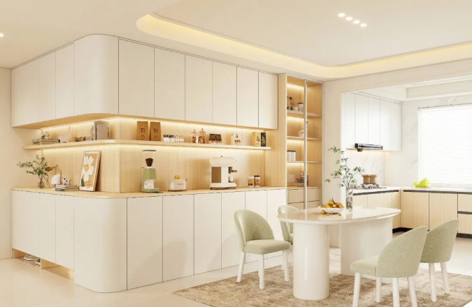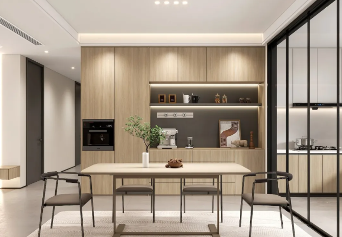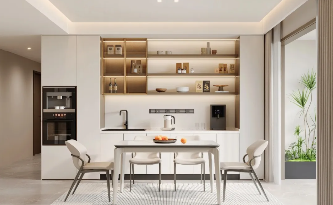 將咖啡機、水壺等小型電器外移至餐廳后,相應的杯具也存放在餐邊柜內,既避免了油污、水漬,減少清潔頻率,在日常飲水、泡茶、喝咖啡時也不用再反復進出廚房,縮短了生活動線,提高居家舒適度。