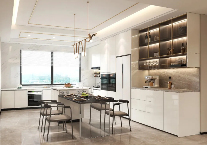 一般適用于開放式廚房,通常呈L型或U型布局,將餐邊柜作為櫥柜的擴充,冰箱等大型電器也能輕松內嵌,不占多余空間;柜體中部留空設置操作臺,中西廚結合,多人操作也不擁擠。
